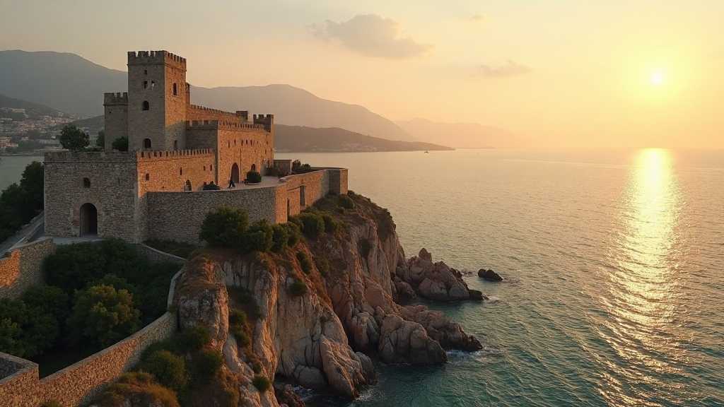 - Manzara: Akdeniz kıyı şeridi, Kale surları, Kleopatra Plajı
